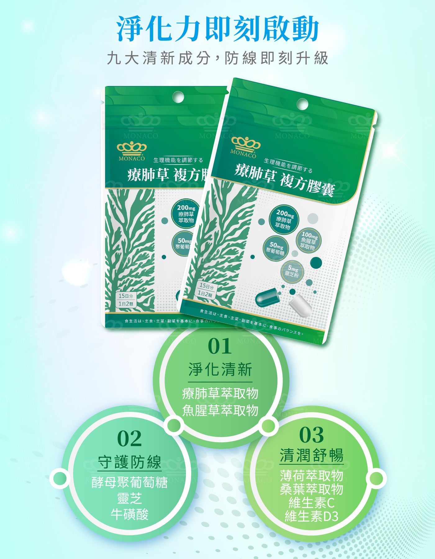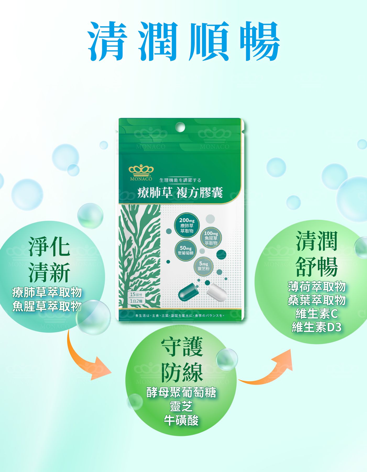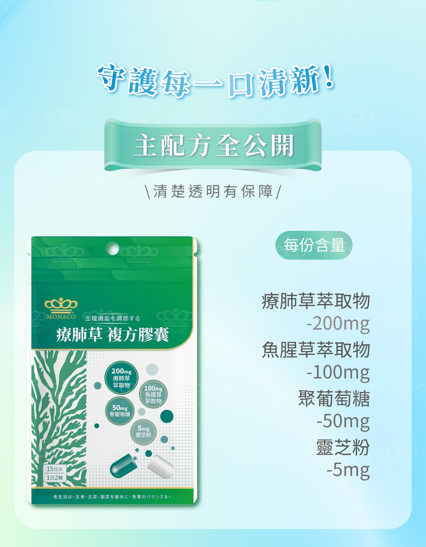 - 商品名稱:魔娜歌® MONACO|療肺草複方膠囊