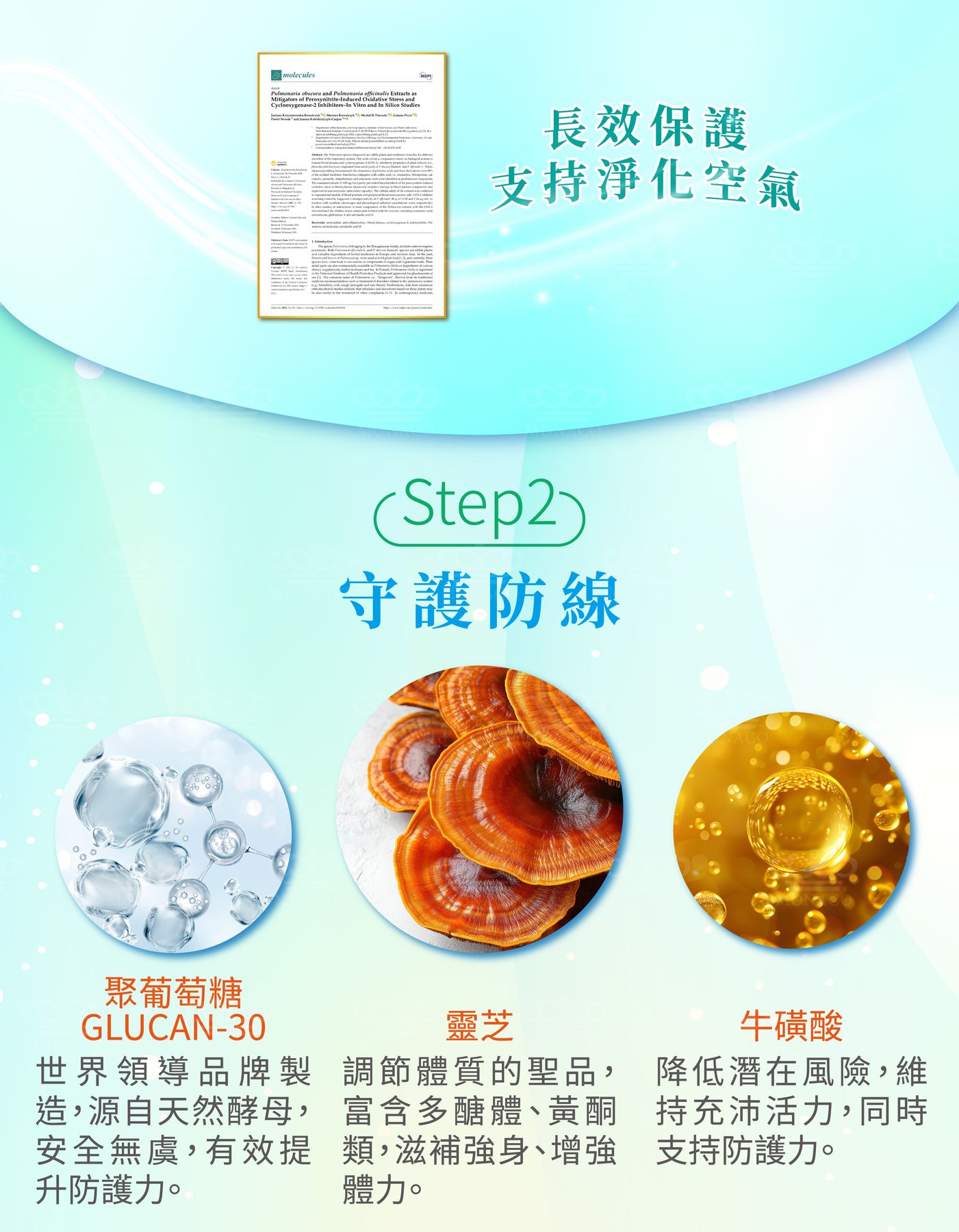 - 成 分:療肺草萃取物(療肺草萃取物、麥芽糊精)、魚腥草萃取物(魚腥草萃取物、麥芽糊精)、牛磺酸、β-聚葡萄糖、硬脂酸鎂、薄荷萃取物(薄荷萃取物、麥芽糊精)、桑葉萃取物、維生素C、二氧化矽、靈芝萃取物(靈芝萃取物(Ganoderma lucidum (Leyss. Fr.)Karst.,子實體,固體發酵)、麥芽糊精)、維生素D3(修飾澱粉、蔗糖、維生素C(抗氧化劑)、中鏈三酸甘油酯、二氧化矽、維生素E(抗氧化劑)、維生素D3)。